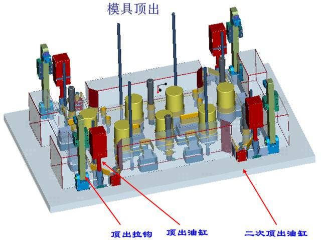 (1)第一級頂出采用4個油缸頂出同前模同步運動頂出60MM,4個拉鉤為輔助機構(gòu);